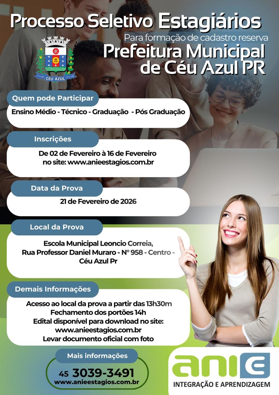 Bom dia! Registrar horário de entrada/saída Processo Seletivo Céu Azul 01/2026 Céu Azul 01/26 Download edital Comprovante Processo Seletivo Tupassi 01/2026 Tupassi 01/2026 Download edital Comprovante Vagas disponíveis Como contratar estagiário Login do estudante Fale conosco