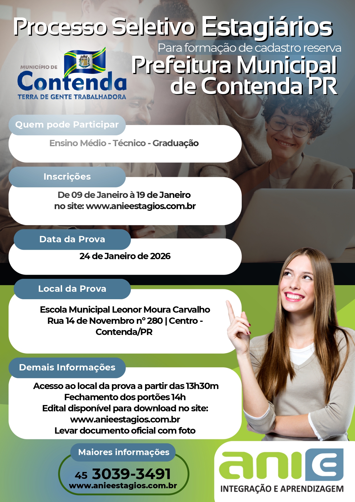 Cadastro da ANIE/PR (sem custo) – xérox do: RG, CPF e declaração da matrícula original, caso aluno menor de 18 anos, cópia do RG e CPF do responsável.